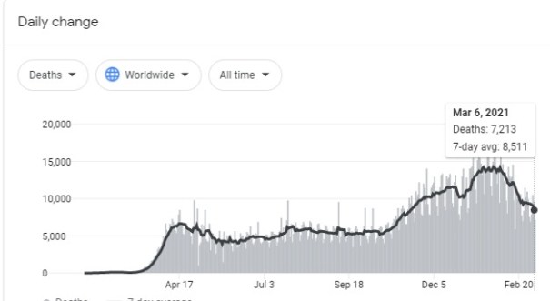 Brazil is going the wrong way in general, with the new record high. I predict by May, they will be averaging 2500 daily deaths, with fewer than 5% of the population fully vaccinated. Brazil accounts for 18% of all deaths from Covid-19 worldwide and may climb to 40% by May, 2021 (2500 in Brazil verses 6000 worldwide).
