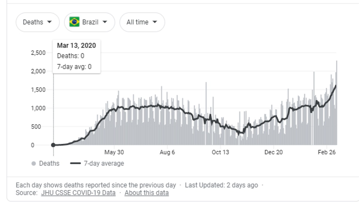 In Brazil, the daily deaths due to Covid-19 made an all time record, of 2,286 on March 10, 2021. These are people who did not make it out of the hospital. This is four times as many people as four month ago. This is real and it is scary. Brazilian hospitals are overrun with new cases. When hospitals run short of equipment such as ventilators, more people die.
