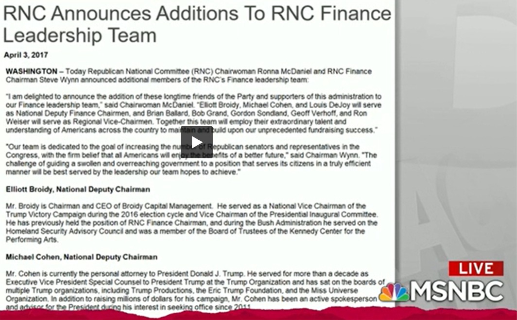 Steve Wynn , Elliot Broidy, Michael Cohen and Louis DeJoy on April 3, 2017 were “long time friends of the Party.” So, what have these fine people done lately. Sexual misconduct, financial fraud, and writing a soon to be released best seller.